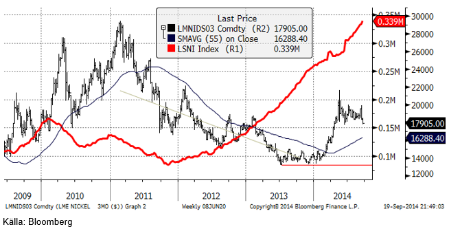 Enligt den senaste statistiken från Metal Bulletin fortsätter produktionen av NPI (Nickel Pig Iron) nästan opåverkad av Indonesiens exportstopp av malm i början av året. Produktionen av NPI minskade med bara 400 ton från juni till juli, från 37,800 ton (nickelinnehåll) till 37,400 ton i juli. Givet utbudsbegränsningarna i år kom den här statistiken som en överraskning för de flesta. Det har rapporterats att kineserna använder filippinsk malm (med lägre nickelinnehåll) och blandar ut den rikare indonesiska malmen, som Kina lade upp ett stort lager av innan exportstoppet trädde i kraft. Metal Bulletin säger också att lagren av sådan indonesisk malm fortfarande är stora. Detta visar att den skepticism som marknaden på LME visar inför högre pris är befogad.