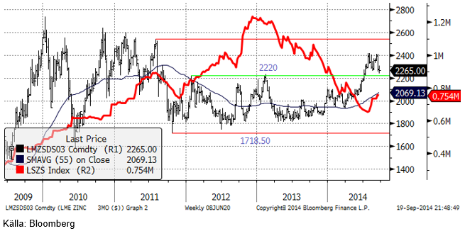 Oron för den kinesiska efterfrågan ökar. Det gör även utbudet i samma region. Smältverkskapaciteten ser ut att öka. Underskottet i zinkmarknaden under det första halvåret i år väntas vändas till ett litet överskott under det tredje kvartalet. Förändringen i LME-lagren stödjer den här prognosen. Vi ser ungefär samma scenario för zink som för aluminium, dvs en långsamt förbättrande balans, där förbättringen tar en paus under det tredje kvartalet, men väntas komma tillbaka till den stadiga trenden mot slutet av året.