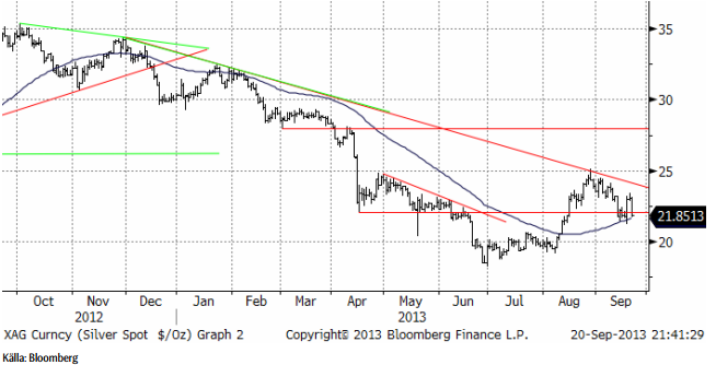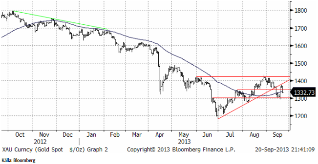 Guldpriset fann stöd på 1300 dollar och rusade uppåt på FED-beskedet om fortsatt penningpolitisk stimulans åtminstone till år 2015. Detta vände till panikförsäljning i fredags när marknaden tolkade uttalandet från St. Louis-FED:s chef som att det nog ändå kunde bli frågan om en minskning av obligationsköpen innan 2015. Den tekniska bilden indikerar att lägre pris är att vänta, men vi har ingen säljsignal än, bara en bruten uppgång.