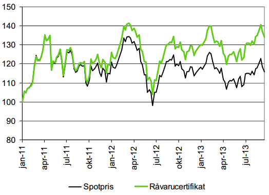 Nedan ser vi hur 100 dollar i början av januari 2011 utvecklat sig om man investerat i fysisk råolja (svart linje) eller via terminer (grön linje). På grund av rabatten på terminerna, har mer än hälften av de ca 35% avkastning under dessa två år kommit från dem – och inte från prisförändring på fysisk råolja.