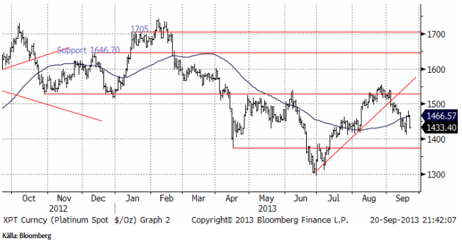 Prisuppgången i platina hindrades vid 55-dagars glidande medelvärde. Tekniskt ser platina svagare ut än både silver och guld. Det är många som hoppas på att platina och palladium ska gå bättre än guld och silver, därför att de också har ett industriellt invändningsområde i katalysatorer. Det innebär att det finns mycket förhoppningar investerat redan i metallerna och egentligen, en ganska stor nedsida.