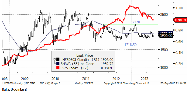 Som vi har noterat tidigare, håller zink-balansen (utbud/efterfrågan) på att förbättras. ILZG rapporterade siffrorna för juli och de visade ett litet överskott. Produktionen av raffinerad zink var 1.109 mt i juli och efterfrågan var 1.095. Detta tog bort optimismen och gav baissarna ammunition. Men faktum är att trenden går mot ett underskott. Det tar naturligtvis tid att beta av de uppkomna lagren, men det ligger i priserna. De flesta som följer marknaden är överens om att gruvkapacitet kommer att stängas nästa år, och att ny kapacitet inte kommer att kompensera detta. Det finns en stor möjlighet till stora underskott framöver. Detta kommer att ge marknaden stöd enligt vårt sätt att se. Samtidigt verkar ekonomierna i Kina, USA och Europa ta fart och den effekten på underskottet måste också beaktas.