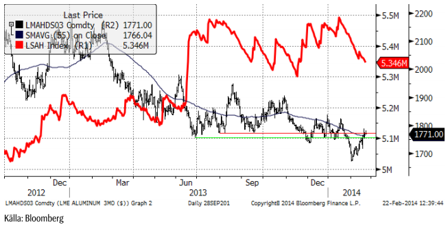 Aluminium var förra veckans starkaste basmetall. Rusal sade i en kommentar i tisdags till Bloomberg att de kommer att stänga av 10% av produktionskapaciteten i år. Senare samma dag meddelade Alcoa att de stänger ett smältverk i Australien, vilket lägger 190 kt till neddragningarna hittills under 2014 (som ännu är ganska små). Med stöd av en svagare dollar, har aluminiumpriset ändå visat förvånande styrka mot slutet av veckan. Tekniskt är marknaden i fallande trend, men ett trendbrott kan vara på gång. Enligt flera källor har tekniskt baserade fonder varit förvånansvärt inaktiva i den här senaste prisuppgången. Priset måste antagligen över 1800 dollar för att de som avvaktar med köp, ska ge sig in och köpa.
