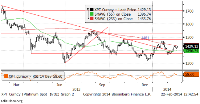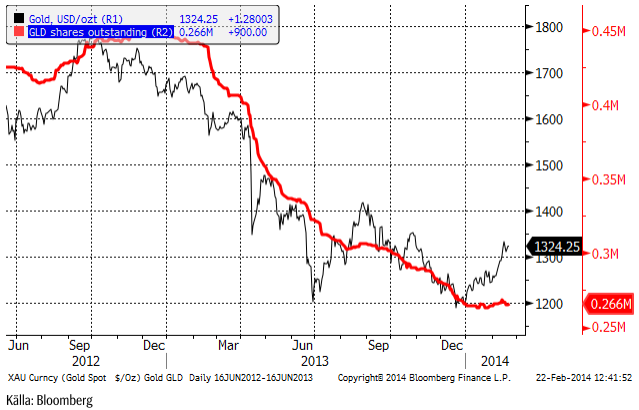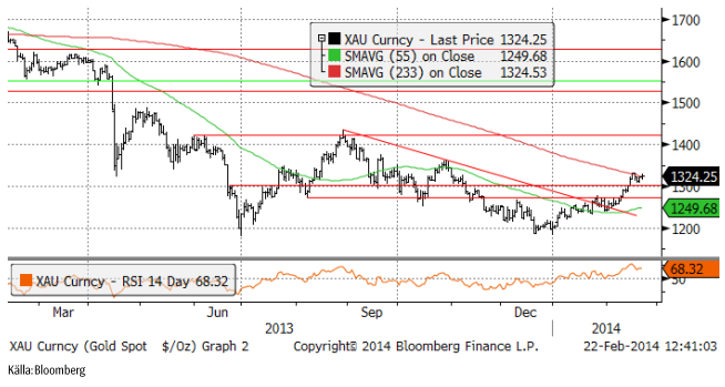 Det är nu tydligt att guld verkligen noterade en botten vid 1200 dollar per uns. Statistiken från USA och Kina som bortförklaras med dåligt väder respektive nyårsledighet, som är just bortförklaringar eftersom de inte passar in i den gängse bilden av ekonomisk återhämtning, kan förr eller senare vändas i mer monetär stimulans. Den chockerande låga takten i nyanställningarna i USA, återspeglad i januaris och februaris NFP-statistik har även USA:s centralbank förklarat bort med dåligt väder. Den nya centralbankschefen Yellen är en duva och det mest hökaktiga hon har sagt gjorde hon när hon svors in. Citibanks valutastrateg beskrev henne som en person som aldrig ändrar sig. Så det talar för en mindre takt i tapering och därmed att starten på räntehöjningarna ligger längre bort i tiden än ca 2015 – 2016, som man väntat sig.