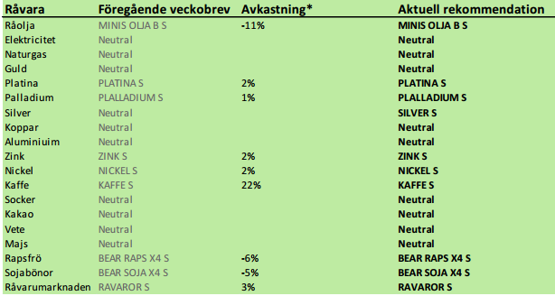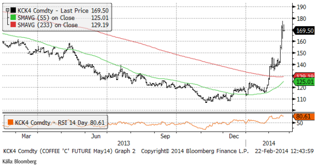 Vi går nu över till neutral rekommendation på kaffe. Volatiliteten kommer naturligtvis att fortsätta att vara hög och när nya produktionsestimat för Brasilien publiceras, ska man vänta sig att det bli stora rörelser. Den som är med på rätt sida av rörelsen kan tjäna stora pengar fort – och vice versa åt andra hållet. Troligtvis går torkan till historien som en av katastroferna i Brasiliens kaffehistoria. Hur stor, återstår att se.