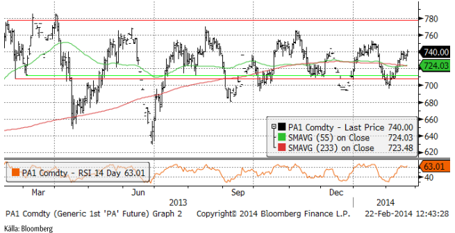 Palladium, som stängde i fredags precis på det tekniska motståndsnivån 740 dollar, kan vara på väg att gå ännu högre, men med tanke på hur många gånger priset vänt ner från den här nivån, skulle vi hellre föredra att vara köpta platina än palladium. Det som gör att vi trots allt ändå håller kvar köprekommendationen är att priset förmodligen går upp raskt om orsaken till motståndet försvinner och motståndet bryts.