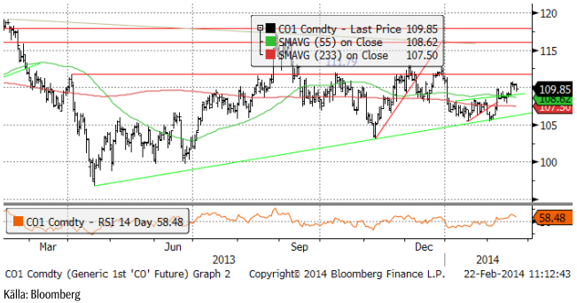 Vi skrev förra veckan att priset kunde gå till 109 dollar, baserat på den tekniska analysen och det var vad som skedde. Den svagare makrostatistiken från USA och Kina ”borde” dock ha en påverkan på oljemarknaden motivera ett lägre pris.