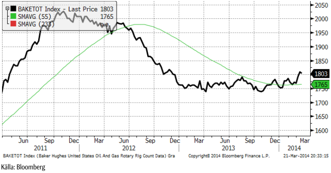 Antalet borr-riggar i USA, statistik som Baker Hughes publicerar klockan 18 CET varje fredag, visar en lite nedgång från förra veckan, till 1803. Trenden till fler borr-riggar är dock tydlig, om än i ett tidigt skede.