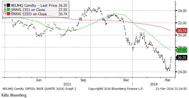 Väderleksprognosen har slagit om från blött och varmt och det innebär att den hydrologiska balansen försvagas med 1.5 TWh till +2.5 – 3 TWh enligt PointCarbon. Marknaden har legat kort och blankarna fick bråttom att köpa tillbaka kontrakt och stänga positioner, vilket gav skjuts uppåt på priset. Som vi har skrivit tidigare kan en vändning uppåt bli våldsam, när den kommer. Vi tror att vi kan ha sett botten vid 24.15 euro per MWh, strax över den jämna nivån 24 euro. Efter en så lång nedgång brukar dock aldrig priserna vända spikrakt uppåt, men vad vi tror att det kan bli oroligt och volatilt den närmaste tiden.