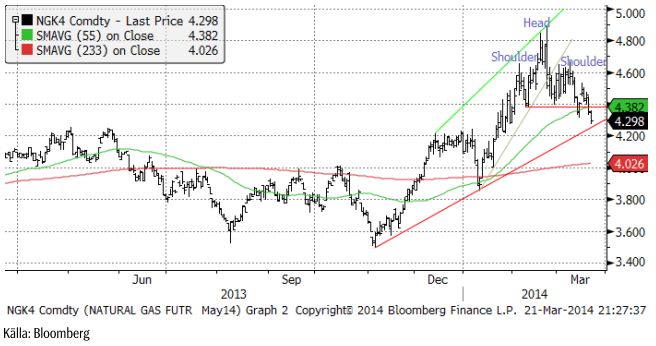 Förra veckan rekommenderade vi köp av BEAR NATGAS X4 S mot bakgrund av att priset stigit en längre tid på det kalla vädret i USA och att varmt väder nu ”borde” komma in i prognosfönstret. Samtidigt såg vi att antalet borr-riggar återigen ökar tydligt och de flesta av dem producerar gas. Japan drar igång sina kärnkraftverk nu och slutar därmed att importera LNG. Det har talats om, bland annat i en annons i New York Times i fredags som en privatperson (!) satt in med anledning av krisen i Ukraina, att EU skulle importera LNG från USA. Om det sker, som en del i det ”paket” som EU och USA ställer upp mot Ryssland efter söndagens ”val” i södra Ukraina, kan det verka stödjande på priset, men annars bör priset i första hand falla ner mot 4.30 – 4.20 dollar per MMBtu. Vi fortsätter med säljrekommendation och behåller BEAR NATGAS X4 S.