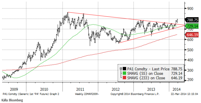 Vi skrev förra veckan att rekylen nedåt efter utbrottet från triangelformationen är klassisk. Vi skrev att vi ville se en bekräftelse på utbrottet genom att priset skulle passera förra årets topp på 785 dollar. Det har vi nu. Priset stängde i fredags på 788 dollar. Vi har alltså med hög sannolikhet en rejäl ”bull market” i palladium framför oss.