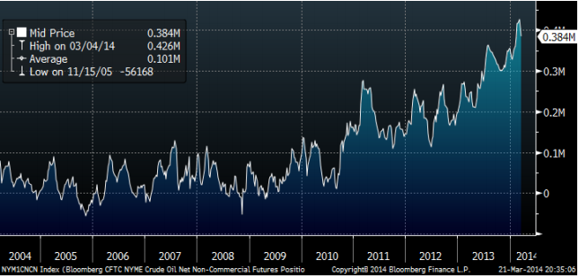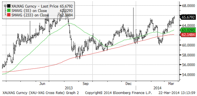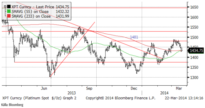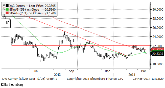 Guldpriset som föll kraftigt efter motstånd vid 1400 dollar, stängde upp i fredags. Priset föll tidigare i veckan efter att FED:s chef Janet Yellen i ett tal talat om prognosen för när räntorna ska börja höjas i USA. I fredags annekterade Ryssland Krim och EU gjorde en politisk överenskommelse om stöd till Ukraina. USA skärpte sanktionerna mot ryska politiker och affärsmän med koppling till Putin; i praktiken de personer som kontrollerar stora delar av ryskt näringsliv. Guldpriset reagerar positivt på geopolitisk oro. De enda länder som ställt sig på Rysslands sida och erkänt Krim, är Nordkorea och Syrien, världens främsta skurkstater. Det är rent objektivt sett ett passande sällskap för Ryssland. Ryssland har visat för alla att internationell lag inte gäller för dem. På sociala medier har Ryssland med råge återfått positionen som ”the Evil Empire”, som USA:s förre president Ronald Reagan kallade det. USA är dock mycket svagare än då, både politiskt, ekonomiskt och militärt eftersom det är upptaget på olika håll i världen i sitt krig mot terrorismen. Det är en ny verklighet och guldpriset anpassar sig till det när investerare ser över sina placeringar.