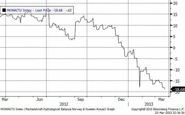Det är en kall och torr vår gör sommaren kort, skrev Lars Wivallius år 1642. Den hydrologiska balansen för NordPools börsområde har sjunkit ytterligare från -15.89 TWh till -18.68 TWh. I prognosen ligger den på -26 TWh. Det är en nivå där vattenkraften kan bli en av de dyrare energikällorna under det tredje kvartalet.