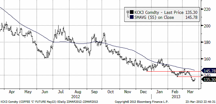Kaffepriset (maj 2013) fortsatte ner i veckan som gick och fortsatte därmed den fallande trenden.