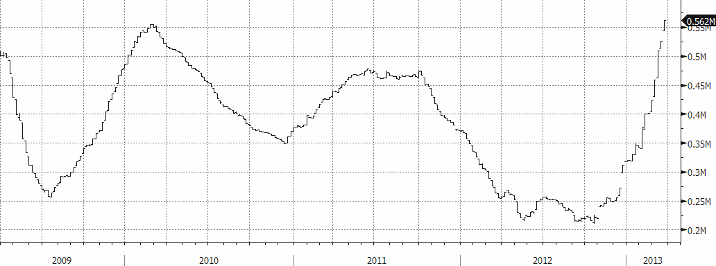 Nedan ser vi amerikanska råoljelager enligt DOE i tusen fat. Den svarta kurvan är 2012 års lagernivåer vecka för vecka och den lilla röda linjen är 2013 års nivå. Vi ser att lagernivåerna fortsätter att vara högre än de varit sedan 2007 för den här tiden på året.