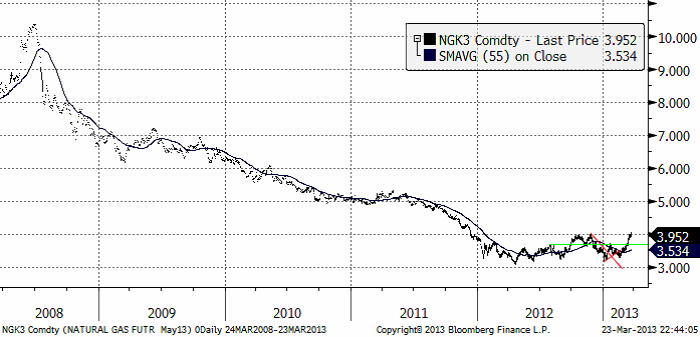 För lite mer perspektiv, ser vi kursutvecklingen på samma maj-kontrakt för de senaste fem åren nedan. Det ser onekligen ut som om något håller på att hända med priset – shale gas till trots!