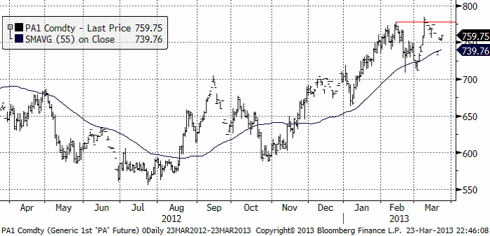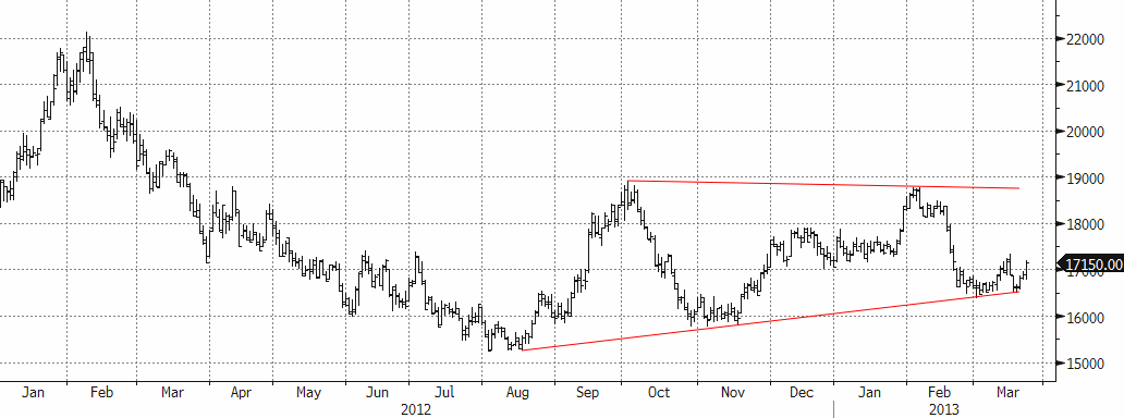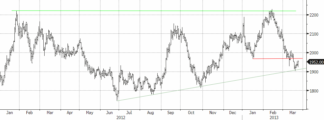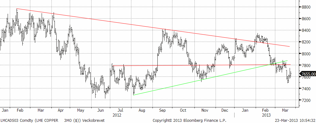 Under veckans inledning (i samband med nyhetsflödet kring Cypern) bröts även stödnivån $1975. Som lägst handlades nivåer i närheten av den starka stöd linjen, som kommer in strax över $1900. Det ”gamla” stödet utgör ett nu istället ett motstånd om det prövas underifrån. Tekniskt sett bör man avvakta lite för att se om trendlinjen håller, och bryter 1975 igen så är det ett köp. Fundamentalt är zinken ”billig” ur ett kostnadsperspektiv och nuvarande nivåer är intressanta på lite längre sikt (12 månader).