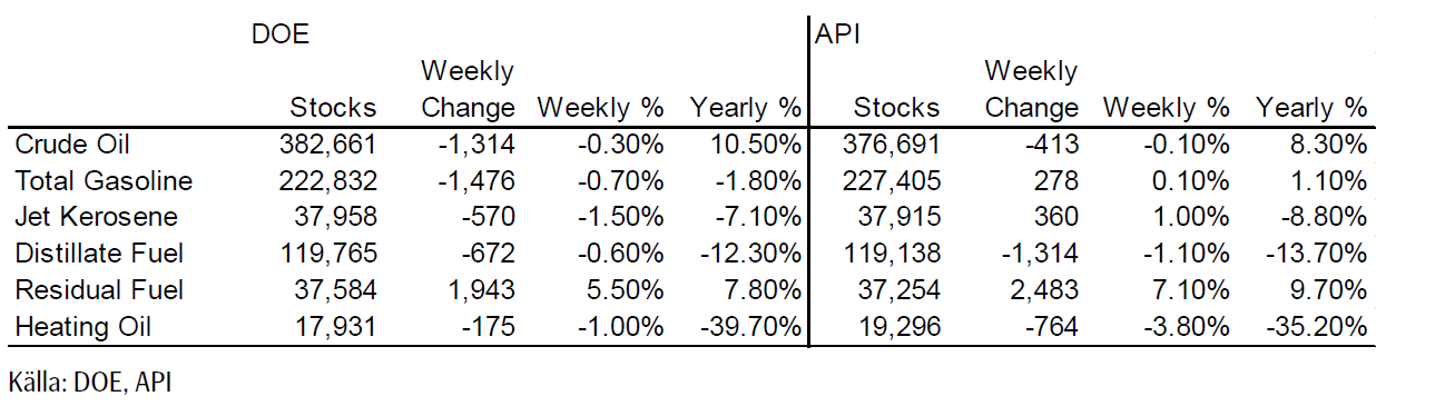 Lagren och lagerförändringarna i USA per den 15 mars ser vi nedan, enligt Department of Energy och American Petroleum Institute.