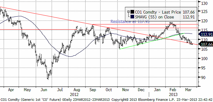 Oljepriset har fortsatt att falla. Tekniskt ligger priset som vi ser ganska mitt i ett kursintervall mellan 105 och 110 dollar, som under förra året utgjorde en lägre nivå i det lite större intervallet 105 – 120 dollar. 105 dollar av allt att döma en viktig stödnivå.