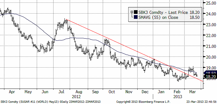 Sockerpriset (maj 2013) som inte lyckades ta sig över 19 cent, har fortsatt att falla i pris. Trendlinjen från pristoppen i juli förra året är dock bruten, vilket är ett positivt tecken. Vi ser prisfallet nu som en rekyl nedåt, snarare än ett återfall in i den fallande pristrenden.