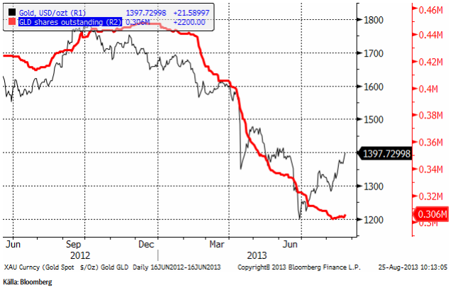 Den största börshandlade investeringsprodukten på guld, GLD, som investerare sålt av friskt under våren, har faktiskt attraherat nettoinflöden för första gången sedan november förra året. Vi ser antal GLD-bevis utestående i röd kurva nedan och guldpriset som den tunnare svarta.