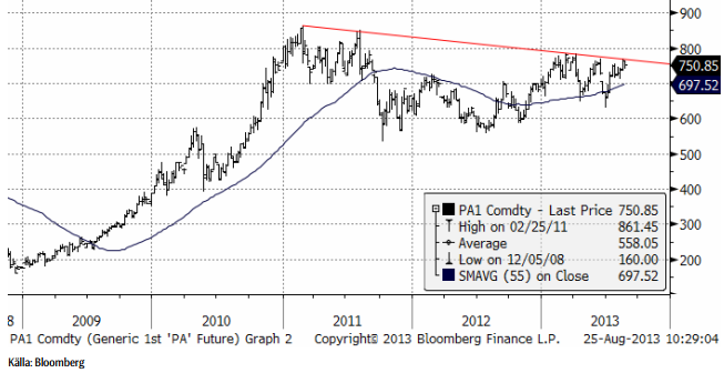 Palladiumpriset ligger precis under ett tekniskt motstånd. Det är en mycket spännande situation rent tekniskt. Motståndet har hållit så många gånger, att ett brott uppåt från den skulle signalera en större förändring i palladiummarknaden. Än så länge ser motståndet dock ut att hålla. Gissningsvis håller motståndet och priset rekylerar nedåt i det korta perspektivet. Skulle motståndet brytas uppåt, vill vi naturligtvis vara köpta palladium.