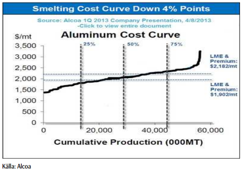 Nedan ser vi produktionskostnadskurvan och LME priset + den fysiska premien.
