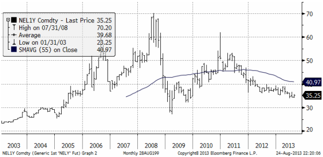 Vi ska se lite mer i perspektiv hur lågt elpriset är just nu. Nedan ser i spotkontraktet på ”årskontraktet” för el, dvs vad det skulle kosta att prissäkra ett helt kalenderår. Just nu är underliggande priset för att prissäkra leverans av el under hela år 2014. Diagrammet är på månadsbasis.