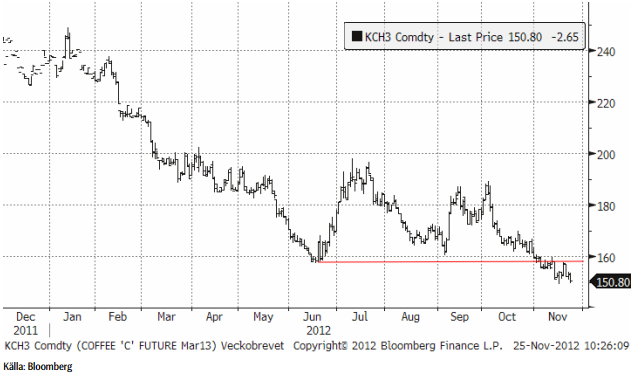 Kaffepriset (mars 2013) har i veckan testat motståndnivån ännu en gång men faller tillbaka. Detta innebär att den negativa trenden har fortsatt. Det finns inget, tekniskt, som pekar på att trenden ska vända uppåt.
