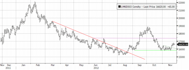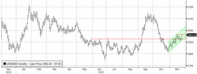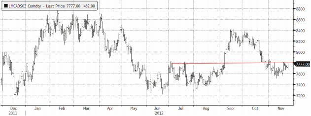 Kinas import av koppar har varit vikande under hösten. De flesta bedömare tror trenden vänder nu. LME-priset har fallit under det inhemska tillräckligt för att stimulera import. Inköpssiffran från Kina ger stöd. Marknaden har under hösten oroats av utbudstillväxten nästa år. Många analyser tyder på ett visst överskott. Veckans statistik från Chiles Codelco, världens största kopparproducent, gällande utbudet perioden Jan-Sep 2012 visar en minskning med 5 % jämfört med samma period förra året. Lägre halter är orsaken. Informationen bekräftar att en stor del av den befintliga kapaciteten brottas med fortsatt låga halter, vilket får marknaden att (återigen) börja ifrågasätta nuvarande prognoser om produktionsökningar nästa år. Prognoserna ligger mellan 5-10 % ökningar, vilket teoretiskt skulle kunna tippa över kopparmarknaden i överskott. Tekniskt sett stänger marknaden strax under motståndet vid $7800.