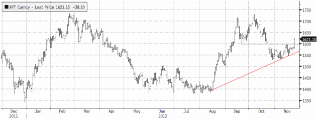 Platinapriset följer guld och silver. Fredagens stängning öppnar upp för ytterligare uppgång till de tidigare topparna kring $1700.