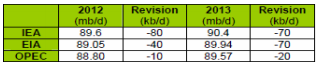 Situationen i Mellanöstern, speciellt konflikten mellan Hamas och Israel i och kring Gazaremsan, har präglat veckan som varit. Ett vapenstillestånd har slutligen kommit på plats men konflikten väntar på en permanent lösning. Syrien och embargot mot Iran, utgör ytterligare hot. Marknaden har samtidigt prisat in en bättre balans mellan utbud och efterfrågan efter de senaste nedjusteringarna av efterfrågan samt starka produktionssiffror från länder som Irak och Libyen. Ny data indikerar att oljemarknaden var välbalanserad under årets tredje kvartal. Efterfrågan för både 2012 och 2013 har också nyligen justerats ned av ”de 3 stora”, se tabell.