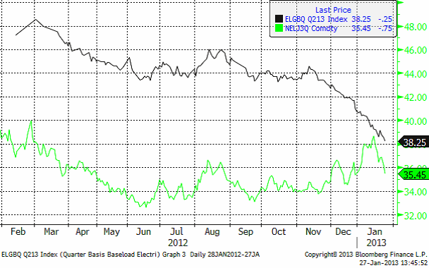 Elpriset i Tyskland (den svarta linjen nedan), speglar prisfallet på kol. Vi ser att prisfallet i Tyskland nu fått ner priset så pass att det börjar tynga priset på NordPool (grön linje). Båda kontrakten avser andra kvartalet och priserna är båda i euro per MWh.