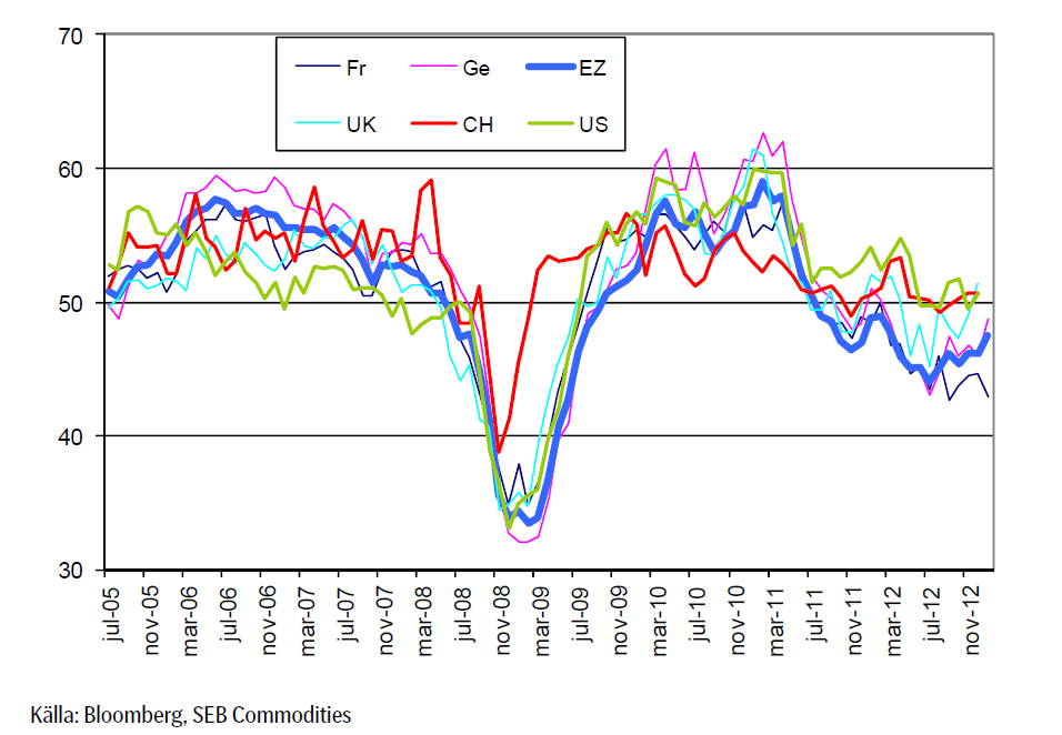 Inköpschefsindex, en framåtblickande “konfidensindikator” ser vi nedan för olika Eurozonen (EZ), Kina (CH), USA, Tyskland, Frankrike och Storbritannien. Generellt sett ser det ut som om väldsekonomin befinner sig ett stadium av “sen recession”. Med undantag för Hollandes socialistiska Frankrike, som fortsätter att falla. “Sen recession” innebär att framförallt energi (råolja) och industrimetaller ökar i efterfrågan. Liksom i förra veckobrevet vill vi gärna lyfta fram råolja och basmetaller / industrimetaller som marknader som kan stå inför en konjunkturell uppgång.
