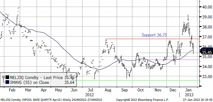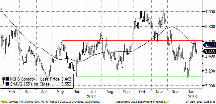 Naturgasterminen på NYMEX (mars 2013) föll så som vi förutspådde förra veckan tillbaka från motståndet vid 3.60 dollar per MMBtu. Stöd finns dock vid 3.40 och det kan vara ett köptillfälle på kort sikt. Vi ser att det stora prisfallet som ägt rum i spåren av fracking-teknikens spridning i USA har stannat av vid 3 dollar. Det senaste året har priset rört sig mellan 3 och 4 dollar. 3.40 är en nivå under mitten av det intervallet. Även om det inte är i botten, ser det trots allt ut som en attraktiv prisnivå. Det europeiska gaspriset är mer än dubbelt så högt och om tillstånd för export av amerikansk LNG ges, finns en viss potential för priset i USA att hamna på en högre nivå på längre sikt.