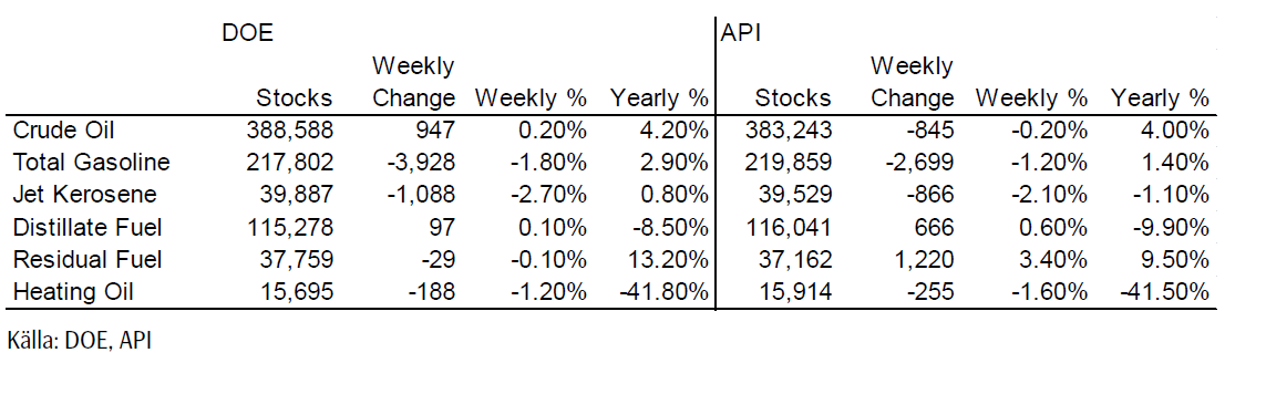 Lagren och lagerförändringarna i USA den senaste rapportveckan ser vi nedan, enligt Department of Energy och American Petroleum Institute. Notera minskningen i råoljelagren!