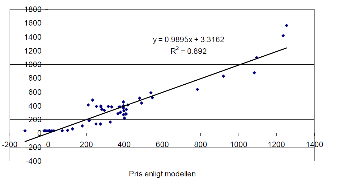 Vi kan dock notera att långsiktigt förklaras guldpriset av demografiska faktorer – ökade inkomster i tillväxtländer. Nedan ser vi guldpriset förklarat av BNP i länder med BNP / capita mellan 2000 och 13000 dollar i dagens penningvärde. Varje punkt markerar ett år sedan 1960 till 2011.