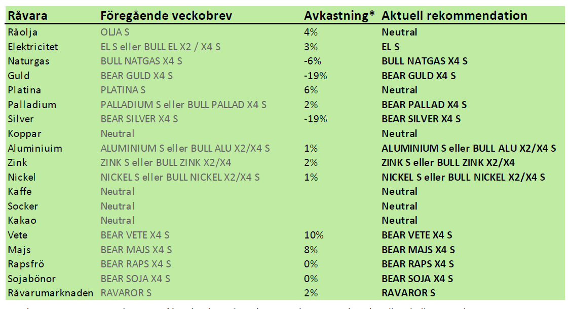 *) Avkastningen avser 1:1 råvarucertifikat där de ingår i rekommendationen. I den aktuella tabellen ovan har jag tagit prisförändringen den senaste veckan sedan det förra veckobrevet publicerades.