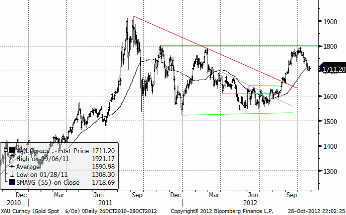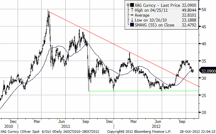Kommentaren från förra veckan får stå kvar. ”Statistiken som kommer in nu är lite ”för stark” för guldet”. Veckans statistik har fortsatt på samma tema: en stadig, om än lite långsam återhämtning i USA. Frågan är dock om det räcker. centralbanken i USA, och i andra delar av världen för den delen, har tryck på sig att fortsätta med stimulanserna. Det ryktas om förestående ”paket” i Japan. Många ekonomer tror på ett amerikanskt QE4 före årsskiftet.