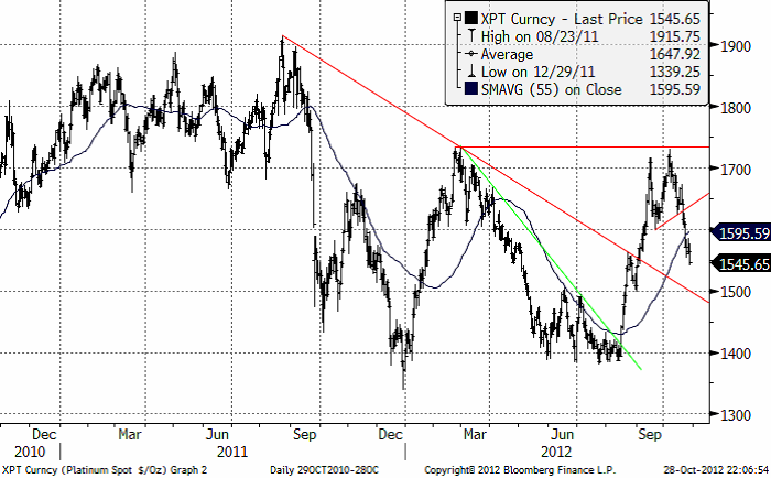 När både guld och basmetaller faller är det svårt för Platinametallerna att hålla emot. Proppen gick ur och vi såg ett kraftigt fall för både Platina och Palladium under veckan. Utbudsfaktorerna (kopplade till problemen i Sydafrika) hjälper inte när investerarkollektivet säljer. Londonnoteringen är ner ca 5 % i veckan till $1550/oz. Kortsiktigt finns risk för ytterligare fall. Med den tekniska analysen som vägledning bör marknaden hitta en bra stödnivå kring $1500. Kursen ligger nu just ovanför den konsolidering marknaden gjorde mellan 1500 och 1560 vid månadsskiftet augusti-september, innan marknaden bröt den nedåtgående trendlinjen. Det skulle inte förvåna om kursfallet bromsas upp, och kanske rent av vänder uppåt efter viss sidledes rörelse på de här nivåerna.