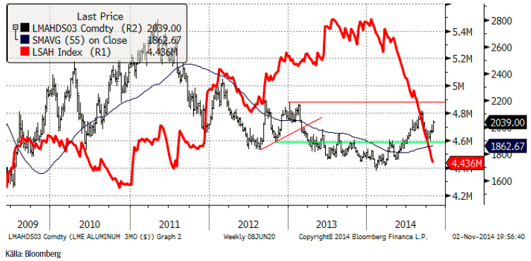 Det är intressant att notera att aluminiumtackor har återlämnats till LME mot lagerbevis (warrants) för första gången sedan det var backwardation senast, i augusti. Detta har noterats bland annat i lagerhuset i Vlissingen. Det noterades ett nettoinflöde även den 30 oktober. Inflödet är ett tecken på att aktörer drar nytta av den backwardation som finns i terminspriserna. De säljer spot och köper tillbaka på termin. Som vi har påpekat tidigare, ger de höga premierna (>500 dollar) i både USA och i EU, en anledning att vid något tillfälle sälja istället för att förnya finansieringsaffärerna.