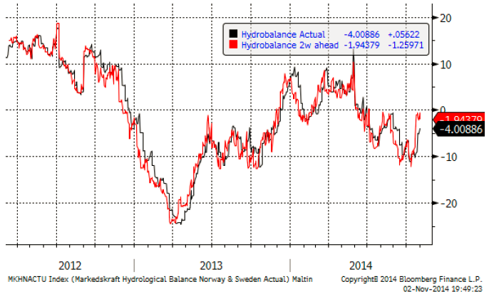 Hydrologisk balans har enligt 2-veckors prognosen stigit till nästan normal nivå. Vädret väntas fortsatt att vara både varmt och nederbördsrikt.