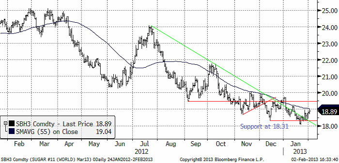 Sockerpriset (mars 2013) rörde sig svagt uppåt från stödet på 18.31 cent i veckan som gick. De senaste två månadernas prisrörelse skulle kunna vara en början på en konsolidering efter det kraftiga prisfallet på socker, som pågått i mer än två år. Den 2 februari 2011 var priset uppe på 31.35 cent som högst.