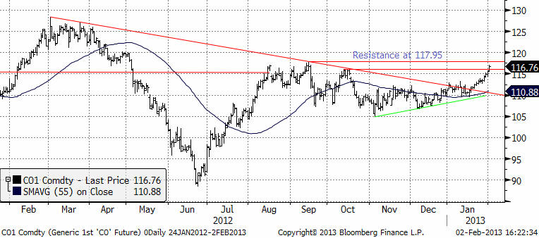 I torsdags kom rapporten från Libyen att utländska oljearbetare lämnar landet, med lägre produktion som direkt konsekvens. Det finns samma oro som i Algeriet. Landets mål att nå upp till 2 mbbl/dag i produktion kommer inte att uppnås. Detta fick oljepriset att stiga rakt genom det tekniska motståndet på strax över 115 dollar. Nästa motstånd ligger på 117.95 dollar. Dit är det inte långt från fredagens stängning på 116.76.