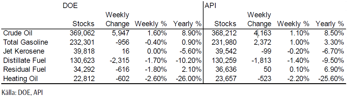 Det var inga stora förändringar. Destillat och eldningsolja har betydligt lägre lager än förra året. Råoljelagren fortsätter att byggas på.