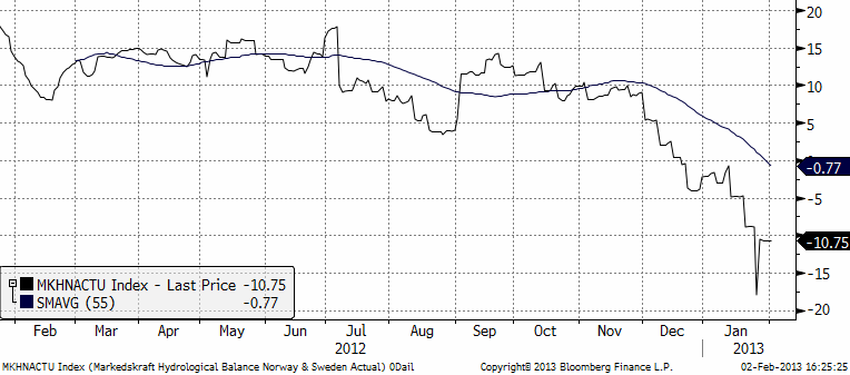 Den hydrologiska balansen för NordPools börsområde låg i veckan still på -10 TWh.