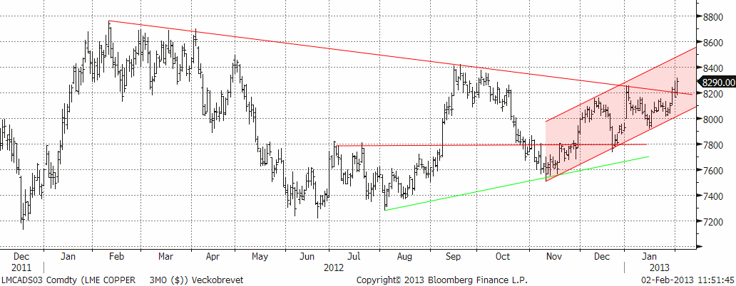 Tekniskt sett får vi en mer positiv bild av marknaden. LME-noteringen bröt i veckan ur den stora ”triangelformationen” och strävar nu uppåt i trendkanalen. Om LME-noteringen (3 månaders) kommer ned mot ”utbrottsläget” $8200 är det köpläge. Detta stämmer bra med vår generella bedömning att metallerna är redo för en rekyl.