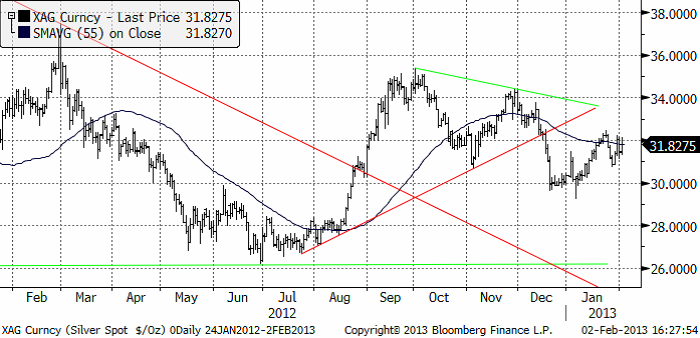 Den tekniska analysen förutspår lägre priser. Det senaste utbrottet skedde på nedsidan från en triangelformation. De två senaste månadernas kursrörelser kan betraktas som rekyler efter utbrottet. Så länge det nedåtgående motståndet inte bryts tycker vi att man bör handla guld från den korta sidan. Å andra sidan har utbrottet följts av vad som ändå får betecknas som ganska svagt momentum på nersidan. Att marknaden inte med någon övertygelse handlar ner priset får kanske tas som ett observandum.