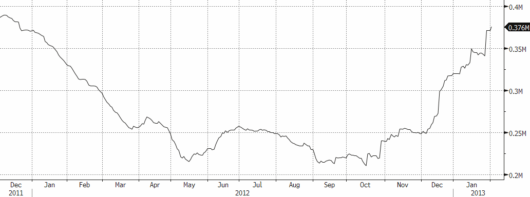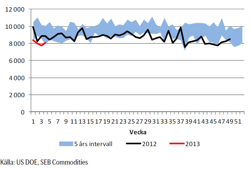 Nedan ser vi amerikanska råoljelager enligt DOE i tusen fat. Den svarta kurvan är 2012 års lagernivåer vecka för vecka och den lilla röda linjen är 2013 års nivå. Vi ser att lagernivåerna fortsätter att vara högre än de varit sedan 2007 för den här tiden på året.