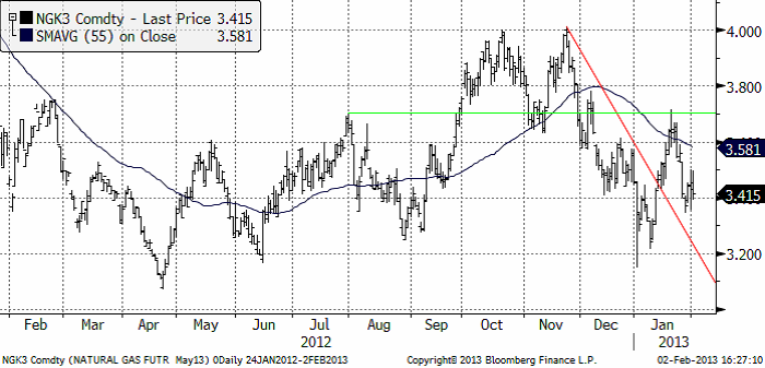 Naturgasterminen på NYMEX (mars 2013) fick stöd vid 3.40 dollar per MMBtu. Det är mitt emellan förra botten på 3.20 och förra toppen på 3.60. Neutralt läge, alltså. Men det senaste trendbrottet skedde uppåt, så vi letar hellre tillfälle att köpa BULL än att gå in i BEAR.